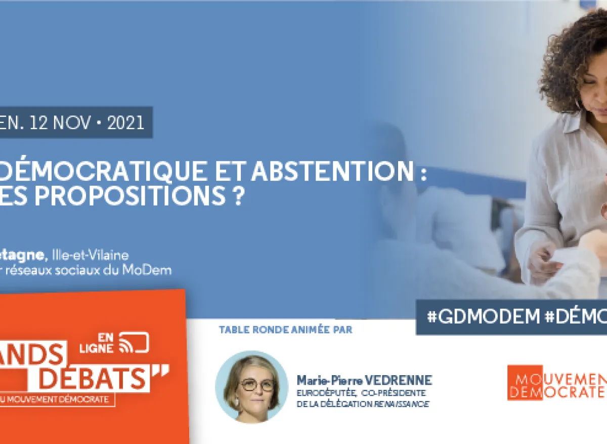 Le vendredi 12 novembre à 18h30, le Mouvement Démocrate organise un Grand Débat "Crise démocratique et abstention : quelles propositions ?" à Dol-de-Bretagne et qui sera retransmis en direct sur les réseaux sociaux du parti. Le Grand Débat sera animé par l'eurodéputée et coprésidente de la délégation Renaissance, Marie-Pierre Vedrenne.