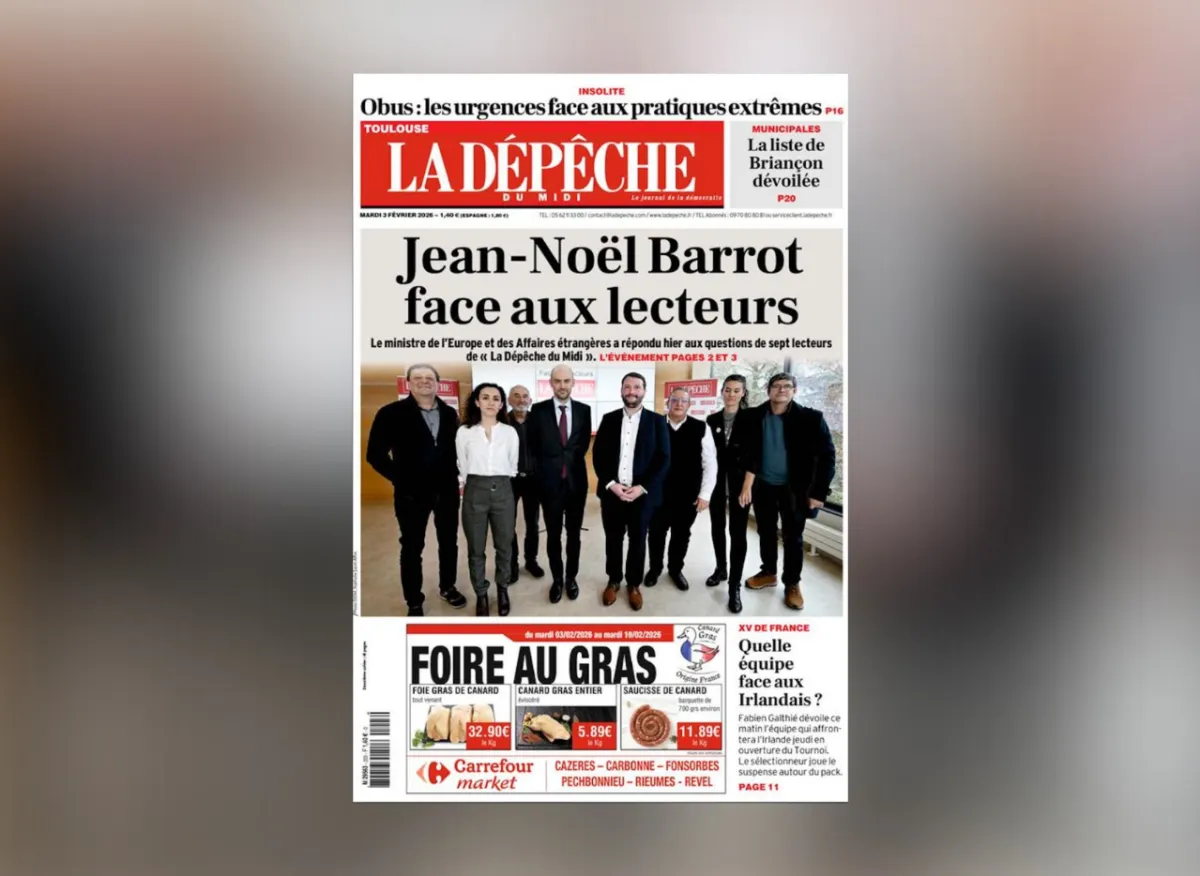 Dans les locaux de la Dépêche du Midi, le ministre de l'Europe et des Affaires étrangères, Jean-Noël Barrot, s’est prêté à un face-à-face avec sept des lecteurs du journal. Menaces de Donald Trump, guerre en Ukraine, crise avec l’Algérie, antisémitisme ou survie de notre agriculture… Le patron du Quai d’Orsay a répondu point par point aux inquiétudes du terrain, défendant une ligne de fermeté face à la "brutalisation" de nouvelles puissances.